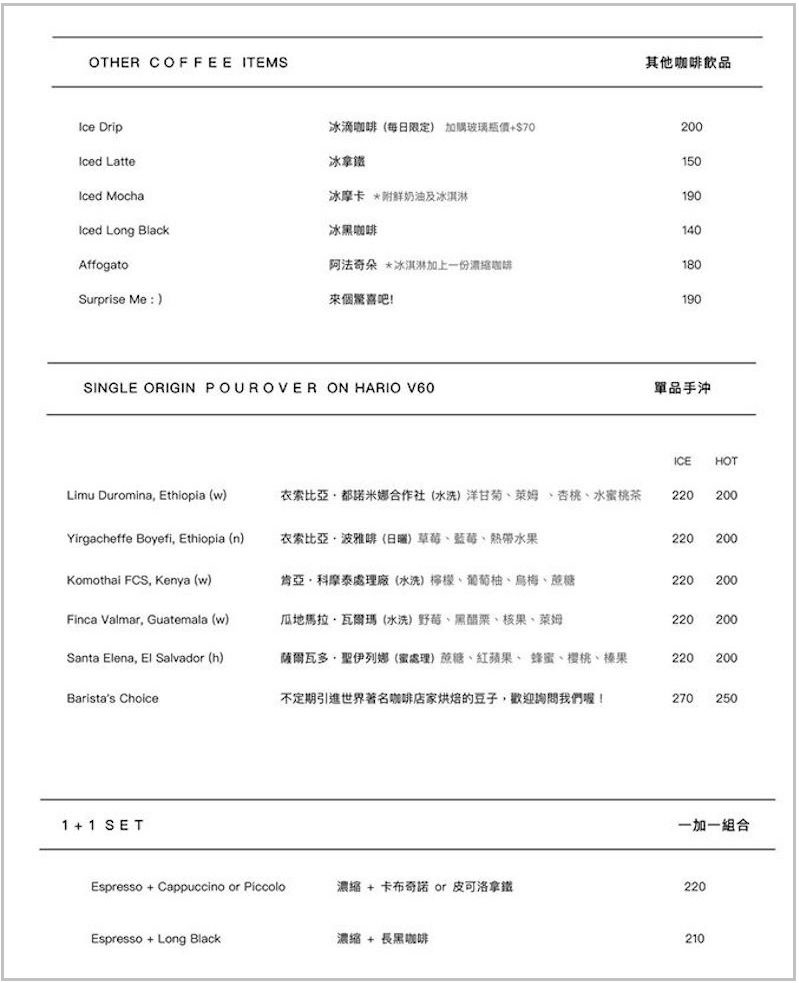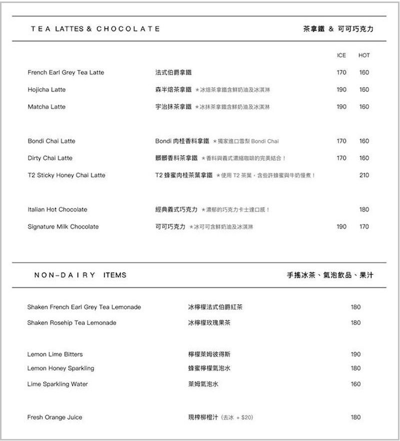 整體飲品多於餐點,飲品包括手搖冰茶、冷壓果汁,還有招牌單品手沖咖啡、義式咖啡等;餐點主要提供澳洲早午餐以及燕麥優格莓碗系列,和少許的帕里尼、蛋糕等。
