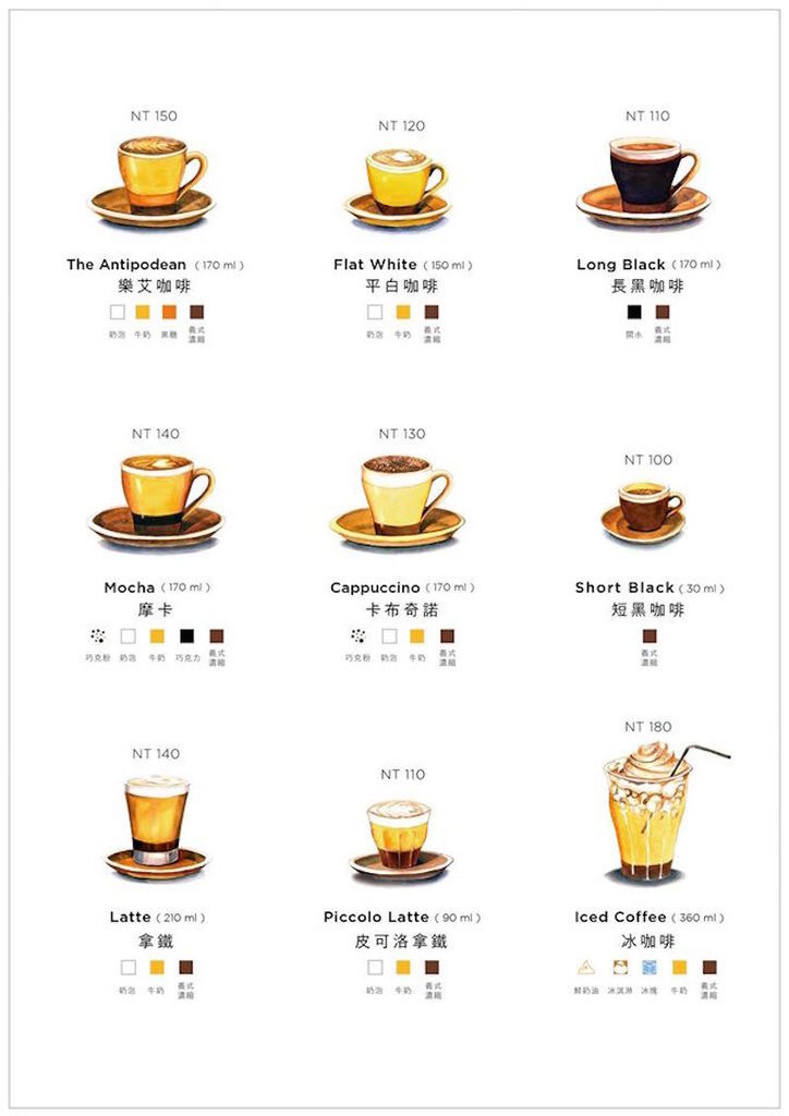 翻開菜單第一頁就是手繪的咖啡menu,咖啡的組成比例一目瞭然,方便對咖啡沒有鑽研的顧客選擇。