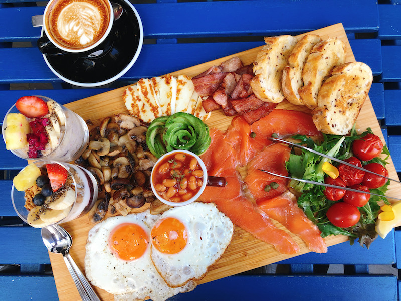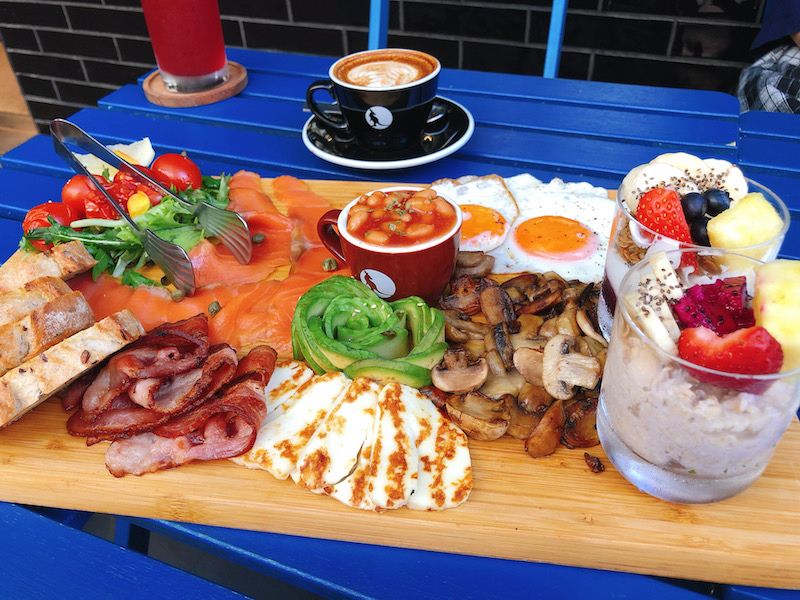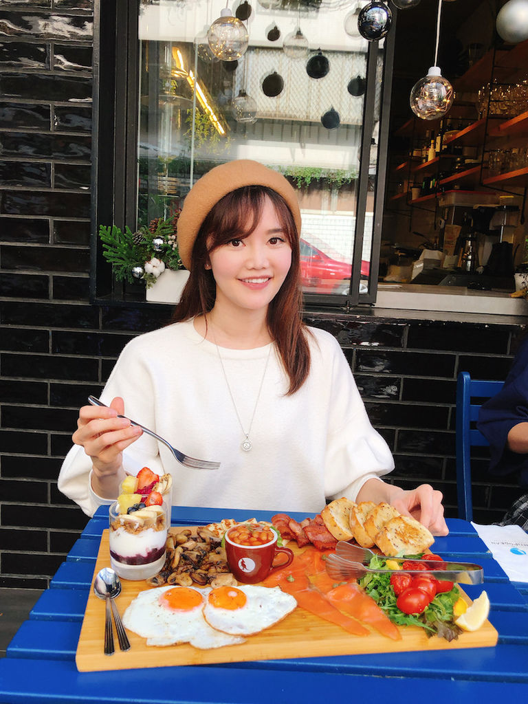 浮誇系的「皇后大早餐」,可以說是The Antipodean店內早午餐的旗艦版,內容包括挪威燻鮭魚、培根、炒蘑菇、哈魯米起司、太陽蛋,佐以芝麻葉的蕃茄沙拉、酪梨、茄汁焗豆和搔耳朵酸麵包,再加兩杯水果優格和水果燕麥粥,數一數總共有11樣啊!超澎派的份量,非常適合和朋友一同享用。
